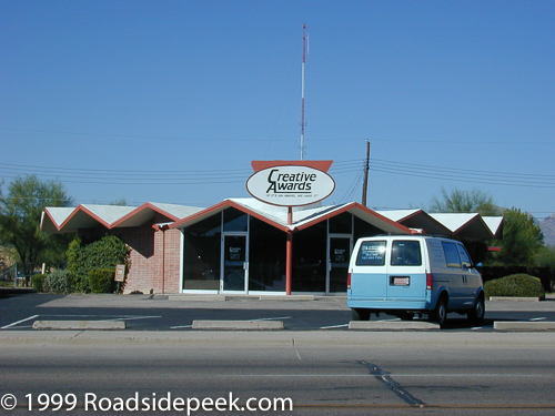 Here's the Creative Awards business that opened in 1974. Creative Awards is a trophy shop that is housed in a mid-century building.