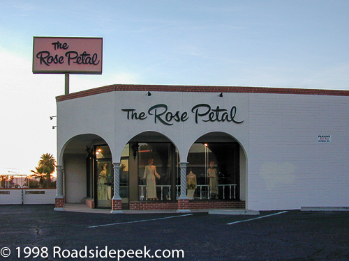 The Rose Petal Bridal appears to be in a mid-century building in Tucson, AZ. The Rose Petal located at 2855 E Broadway Blvd in Tucson was opened by Rose Wartsky in 1971. Word is that the business closed down due to the poor economy in 2011. 06-23