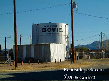 Here's a tank with the familiar Welcome to Bowie sign on it, welcoming travelers coming into this Arizona town. Since the highway bypassed Bowie, traffic through town has slowed down. 03-06