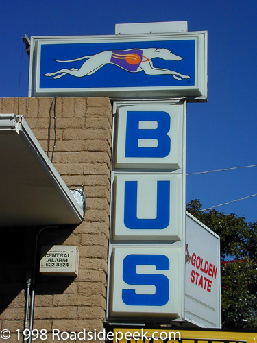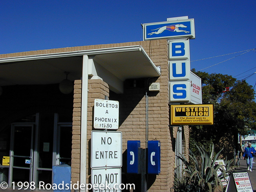Check out the familiar Greyhound Bus Station sign and location in Nogales, AZ. This station features vintage Greyhound bus signs. There's even a Western Union sign on the building.