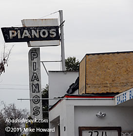 This piano store located in Fresno features an old sign hanging off by the road. Not sure if this location is still in business. 07-11