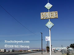 (Near right) A look at the cafe sign and the highway running through Niland