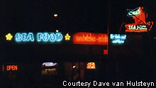 the glow of its neon signage and lettering? Ernie's seafood features a neon boat as part of its marquee, located along this main drag near Hayward.