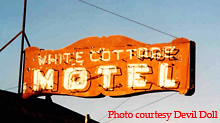 (Far left) A day shot of the White Cottage Motel sign showing off its orange sign