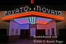 The neon was recently turned on again at the small movie theatre in Novato, California (Marin County). The Novato Theatre is not open presently, but they are trying to maintain the building in hopes of having it open in the future for plays, etc. However, it will take a lot of money to retrofit the building for earthquake safety. 04-06
