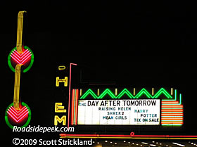 HIghway 40 in Davis, CA is home to the Varsity Theatre which features this neon marquee. The theatre was built and showed its first movie on June 9, 1950. In 1990, the Varsity closed down as crowds dwindled and began a life as a performing arts theatre. The Varsity owned by the City is currently used to show independent films. More information can be found here. 09-08