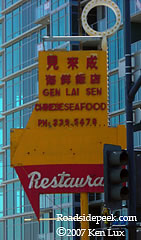 This marquee for the Gen Lai Sen Chinese seafood restaurant features an old sign with an auspicious ring on top of the sign. Not sure if the rink once housed an orb, more lights, or a photo of someone. 06-07