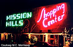 The Mission Hills Shopping Center looks stupendous at night with its neon all lit up. Check out the lettering and the colors of the neon glowing.
