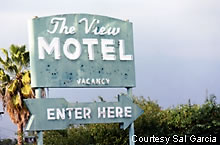 The View Motel still features its roadside sign. The colors scream mid-century and arrow points the way in.
