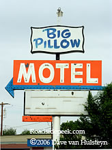 With a name guaranteed to make weary travelers get tempted to turn in for the night, the Big Pillow Motel features a sign with dreamy colors. Wells, NV.