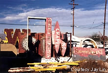 An old Denny's sign sits in the lot of the Neon Graveyard.