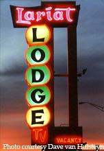 The Route 66 favorite Gallup is home to the Lariat Lodge as well as other neon lit motel marquees. 06-06