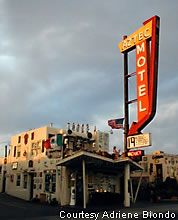 (Far right) A trucker finishes a nap while the Sands Motel marquee