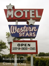 This old roadside motel sign sits in front of the Western Stars Motel in Nara Vista, NM. Not sure if the text on the sign stating "sleep in under the stars" refers to the parking lot as this motel is closed. 06-06