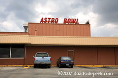 The Astro Bowl in San Antonio, TX features an old time looking ten pin alley marquee. With a name that dates back to the 50's or 60's, hopefully this bowling will last longer than others with the same name. 07-07