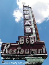 Check out this sign for the Lucas B&B Restaurant of Dallas, TX. It's been there forever. The restaurant actually closed in the late 80's and was heavily remodeled into a Pappadeux's Seafood Kitchen. The sign was in not so good shape for awhile, but they restored it,and now it just sort of stands out in front and blinks at passersby. Probably confuses them, too. 01-06