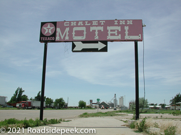 The little arrow points the way to the Chalet Inn Motel in Groom, TX. Located pretty close to the iconic leaning Britten USA Water Tower, the Chalet Inn is a good stop off the 66. 08-21