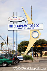 The Seyara Motors in San Antonio features a cool googie style sign out front. The colors also look very vintage.