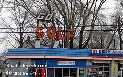 This Gulf sign is located on the roof of a still operating station on US 46 in Fort Lee, New Jersey, about a mile south of the George Washington bridge. 03-08