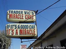 Here's an old sign for Trader Vic's Miracle Cars that goes back