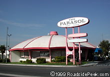 The Parasol Restaurant is a building built in the shape of a parasol. Don't forget to take a look at some of the programmatic architectures examples from across the country at Roadside Peek'sRoadside Vernacular.