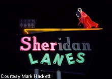 Here's a shot of the Sheridan Lanes marquee at night. It's a shame that all of the neon wasn't burning at