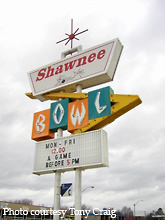 This ten pin alley sign stands tall in the parking lot of the Shawnee