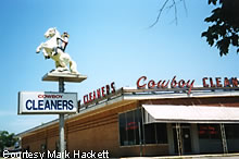 The Cowboy Cleaners is an old cleaners with a statue sitting atop of its marquee.