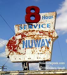 Oklahoma City is home to Nuway Cleaners. This old faded out marquee heavily promotes Nuway's 8 hour service, with a swooping red arrow pointing the way in.