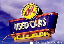 quite plentiful. This sign is still in great condition. Check out the neon still lining all of the lettering of this sign. The OK used cars brand first began by Chevrolet in the mid-1920s and referenced a red O.K. tag system checklist. In a way, this was the predessor to the certified used car system of today.