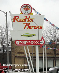 Here's the Red Hot Motors sign, which was formerly some other type of sign that has been repainted with this car lots name. It is located at the corner of Meridian and 5th Street in downtown Anderson, IN. 02-08