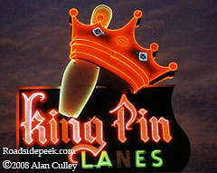 Here's a great shot of the King Pin Lanes marquee in Springfield, MO. Check out the way the neon bowling pin and crown integrate in this shot of the sign. 01-08