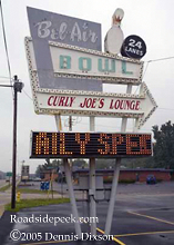 The Bel Air Bowl in Belleville, IL still sports its marquee advertising its 24 lanes and lounge area. 10-05