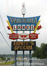 Here's a rather colorful sign at the Panorama Lanes. This bowling alley marquee is a great example of a roadside treasure that has fought the test of time. 10-05