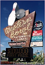 An example of the eye-catching signage of ten-pin alleys, the Plaza