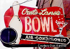 Passing through Crete, Illinois and looking for an evening of bowling? Stop by and pay a visit to Crete Lanes and have some air conditioned fun. Unfortunately, the sign has been removed recently.