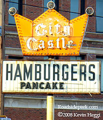 The City Castle Hamburgers in Gary, IN appears to have some sort of resemblance to the White Castle Hamburger name and signs, whether intentional or not. The City Castle appears to also serve pancakes in addition to showing off its great looking sign. 10-08