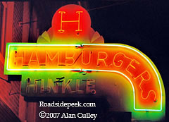 Madison, IN is home to this head stopper of a neon sign. The Hinkle Hamburgers features a well lit up neon sign off the roadside. 07-07