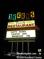 Here are some neon shots of a classic Jerry's Restaurant in Jeffersonville, IN. Famous for their J-boy hamburgers, Jerry's is something like a Denny's or a Big Boy restaurant. This is a chain primarily located in Kentucky, but there are a few locations in surrounding states. 04-08
