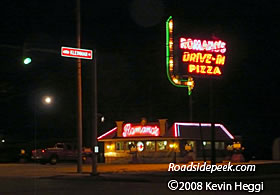 The neon sign points the way to this pizza pub in Highland, IN. Check out the neon marquee for Romano's. Not sure what "drive-in" means here at this pizza pizza place though. 10-08