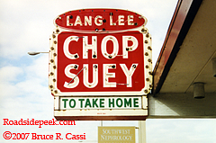 Chicago, IL is home to this Chinese restaurant delight called the Orange Garden. Located in the Lakeview area of town, the Orange Garden prominently displays the words "chop suey" on its sign leaving no doubt as to the type of cuisine served here. According to the Chibbqking site, the restaurant appears from the 1950s era with its old black leather booths and dim lighting. 07-09