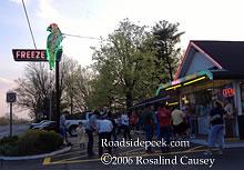 The line looks long as visitors stop by for a tasty treat at Polly's Freeze. Check out the neon on the front of the building.