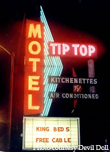 The Tip Top Motel's marquee shines along the roadside. This motel's marquee looks "tip