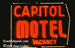 The Wagon Wheel Motel in Cuba, MO was built in 1946. The Wagon Wheel is very well known for its nice accommodations and great neon sign that features an arrow outline that blinks on and off, pointing the way into the cabins. 01-08