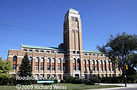 Located on Plymouth was this campus like building for Jeep engineering. I knew of it's existence but never saw it before. There are old pictures of it with a Kelvinator sign in the blank spot near the top of the tower and later in script for American Motors Corporation. 10-09