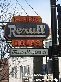 Here's an old Rexall drug sign at Kostrog Drugs in Chicago. This sign features nice working neon lettering though the sign itself is a bit weather beaten these days. Now, here's a new one being advertised on the sign. "Fannie May" candies! 11-09