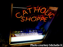 The neon window sign at the Catholic Shoppe glows down