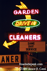 Garden Cleaners has been located on 95th Street in Evergreen Park for well over 45 years. This classic sweeping arrow sign was created by the Flashtric Sign Company in Chicago. Around 1996, a new owner took over and had the sign repaired so all 170 light bulbs would light up. In 2007, it is one of only five neon signs that remain in the village. 04-07
