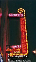 I stopped dead in my tracks one night cruising Milwaukee Avenue when this 3 story neon behemoth for Grace's Furniture appeared out of nowhere. It was manufactured by White Way Sign Company. Note that the business address is scripted in neon on the bottom of the sign and carpeting is also advertised. 06-07