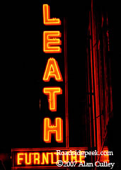 The neon letters for Leath Furniture light up the blade sign in Marion. 06-07